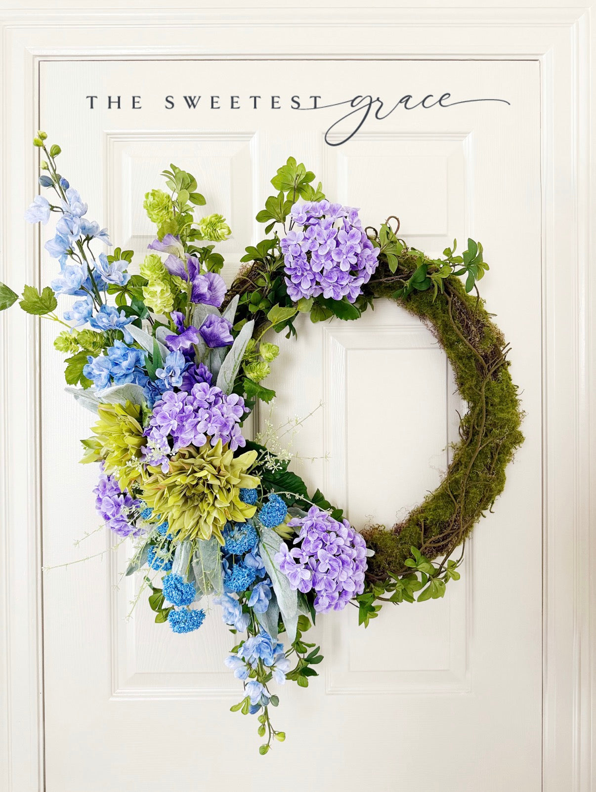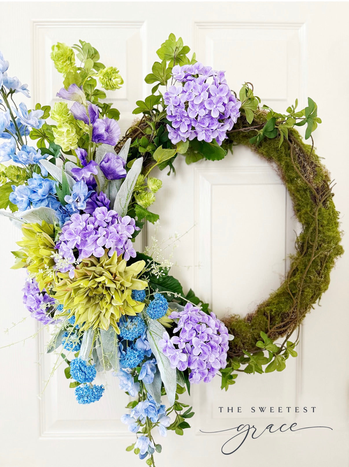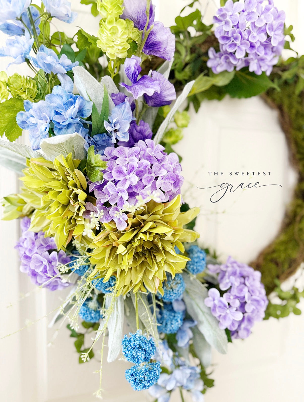 Real touch moss, twig, hydrangeas, dahlias, lilacs, lambsear, and mixed greenery are the perfect pops of color for your door this spring and summer!