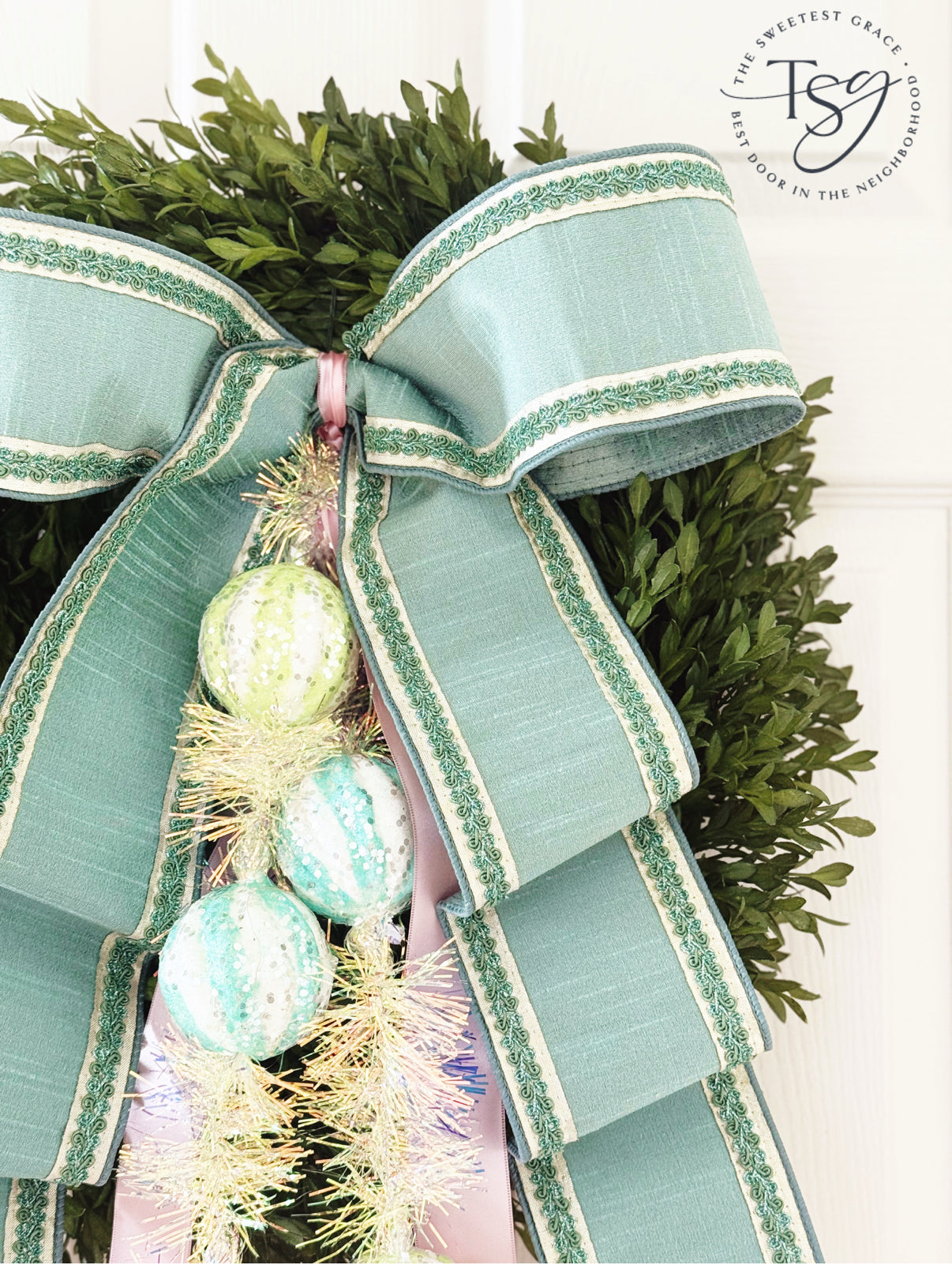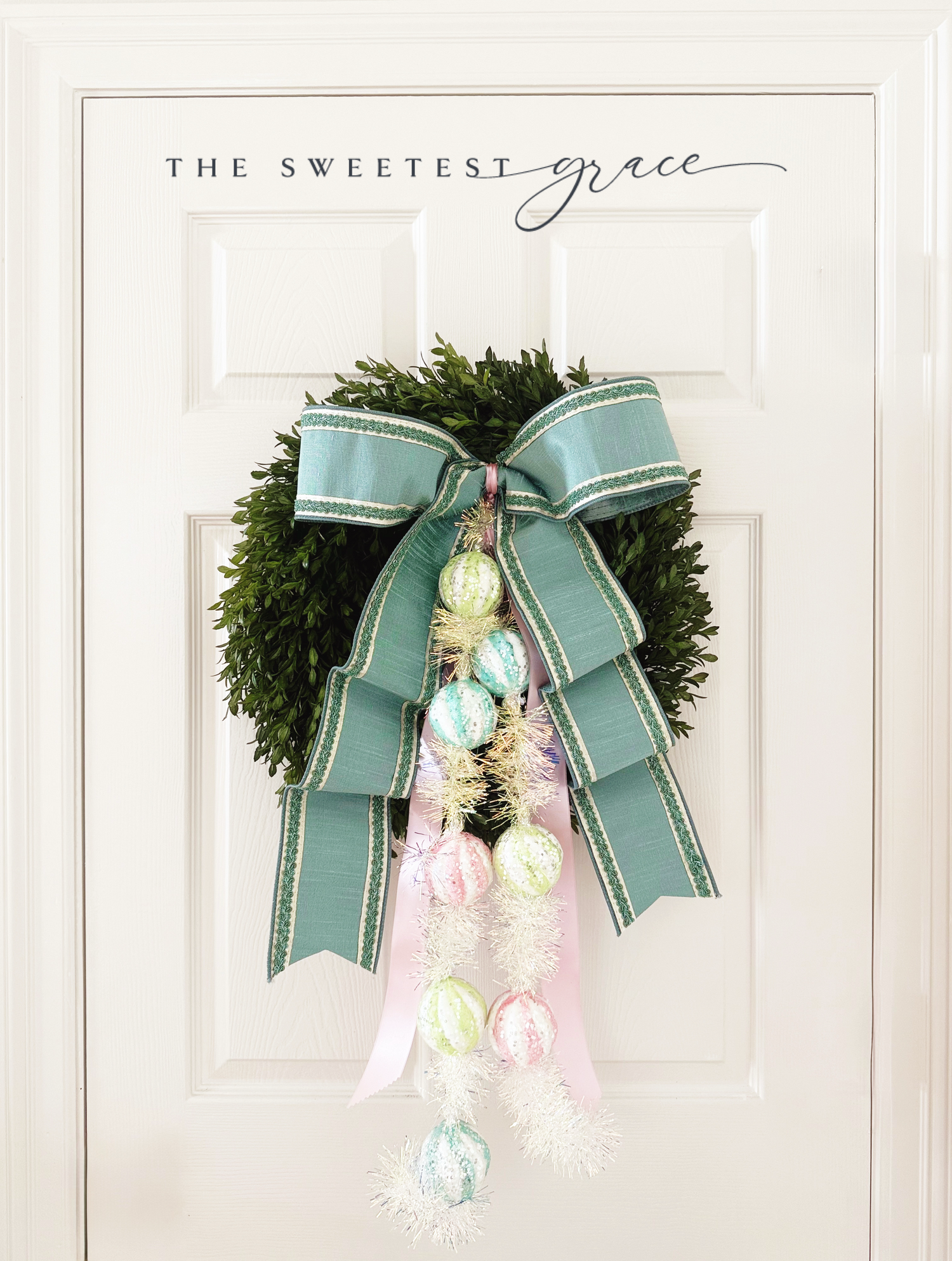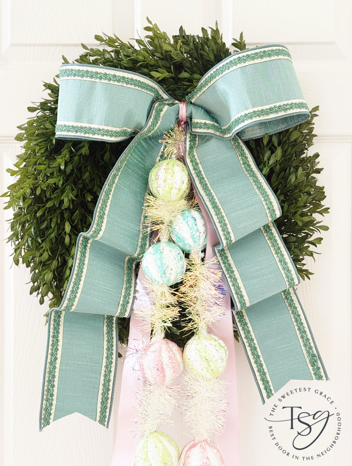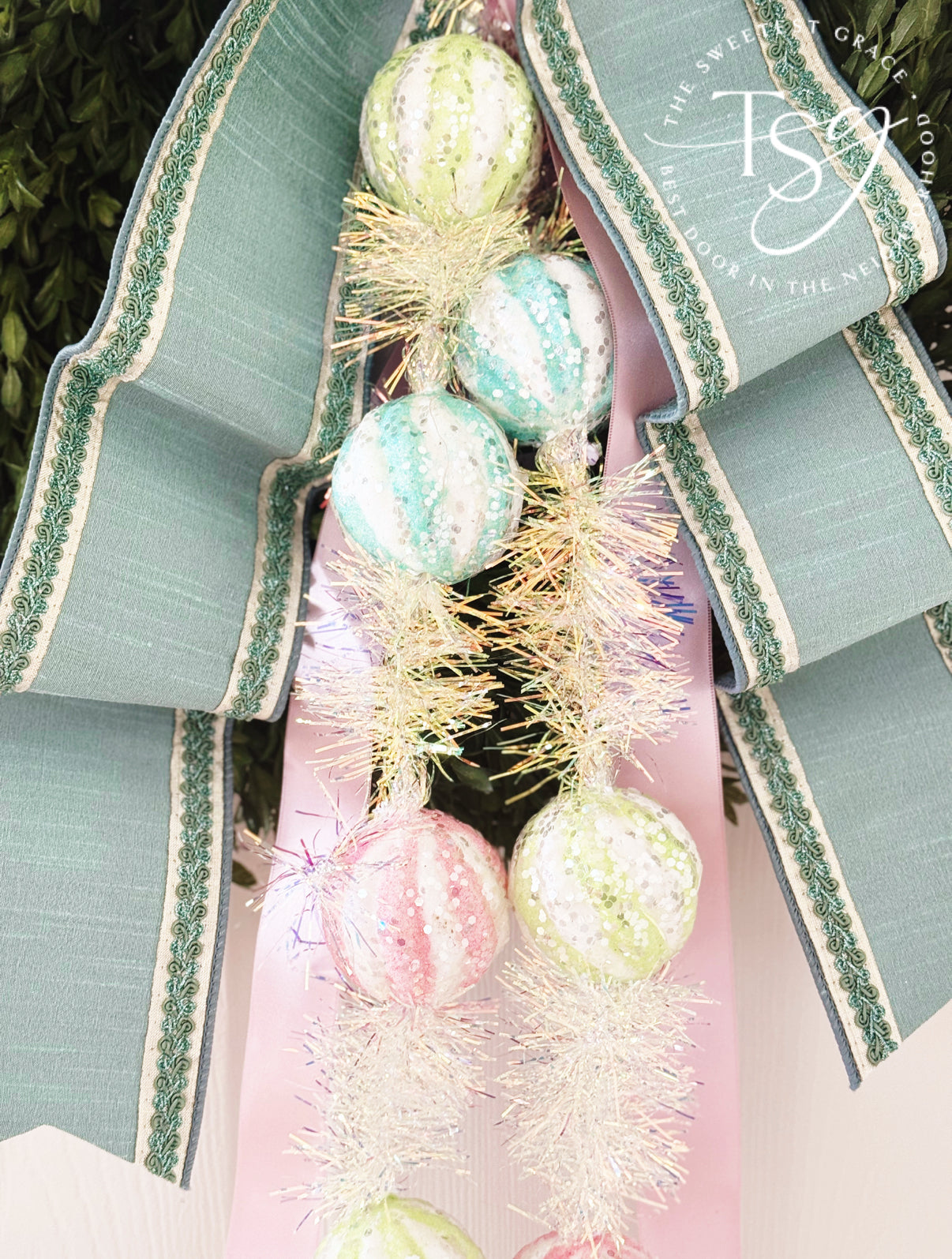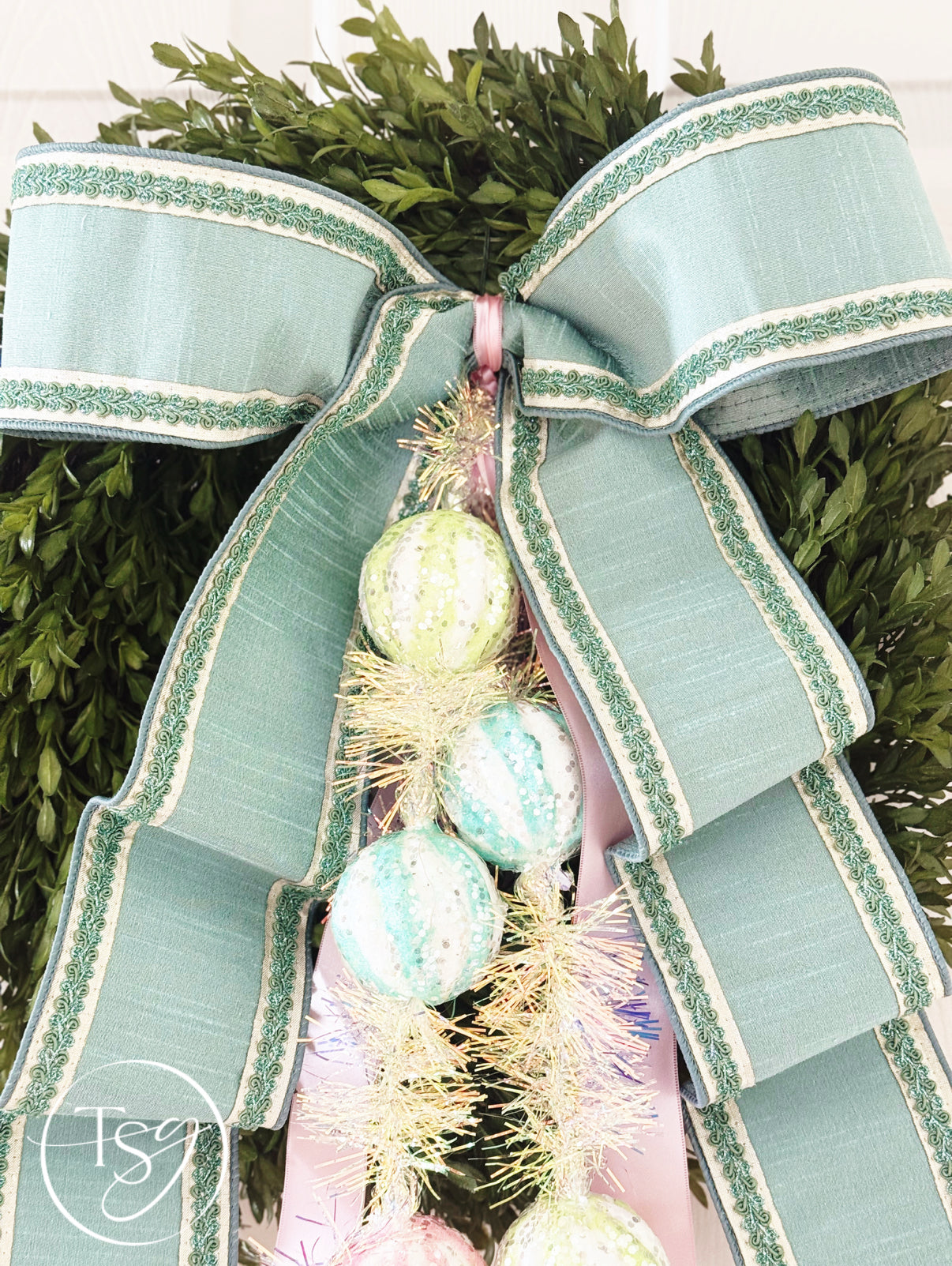 18” tea leaf topped off with a celadon taffeta bow, Candy tinsel garland, and pink satin for a playful style to hang all winter long!