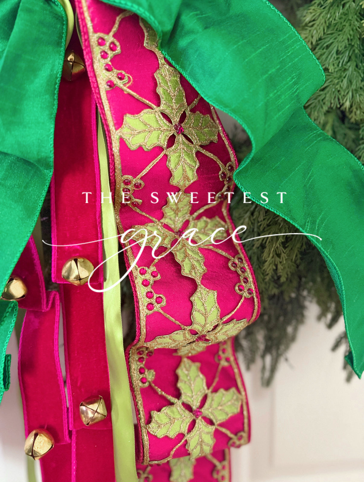24-25” real touch cedar with a layered green silk, beaded, velvet, and bell bow.