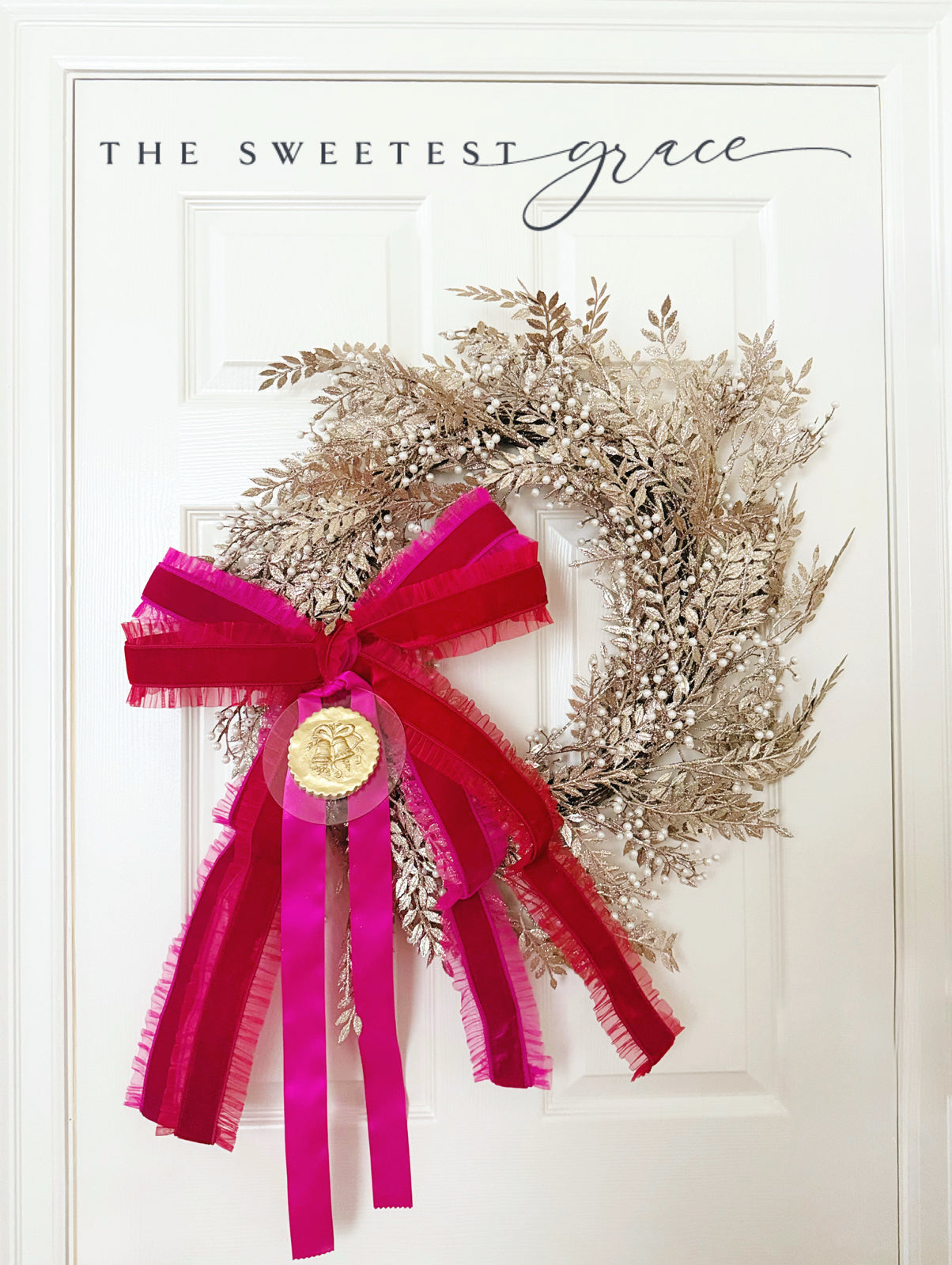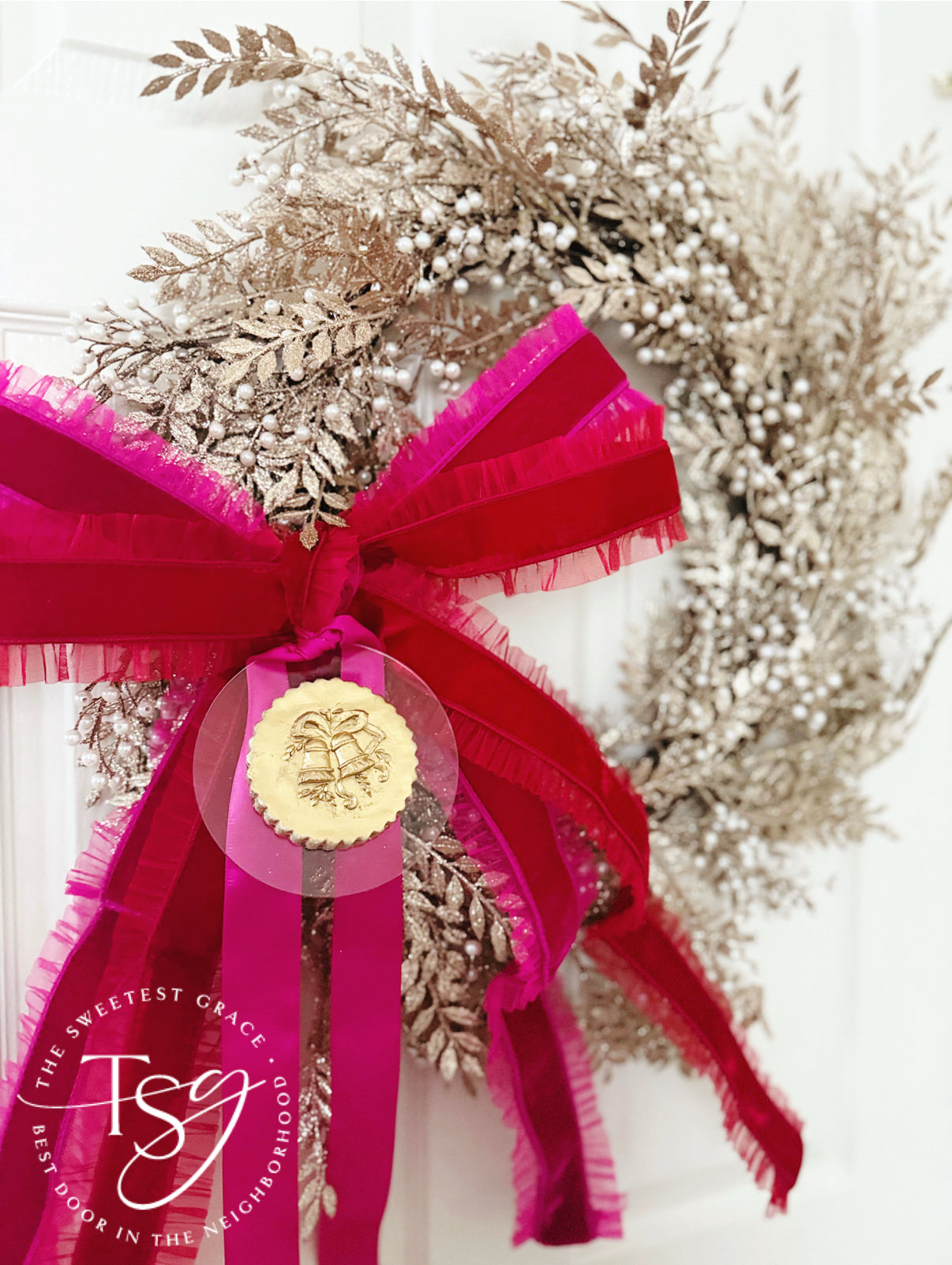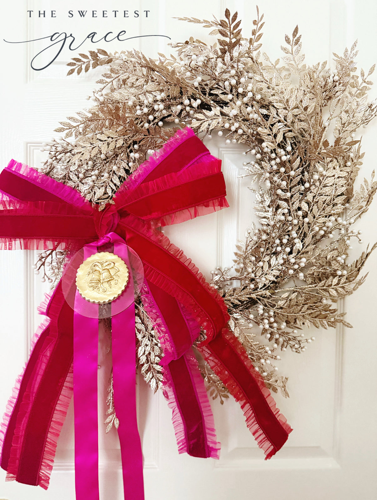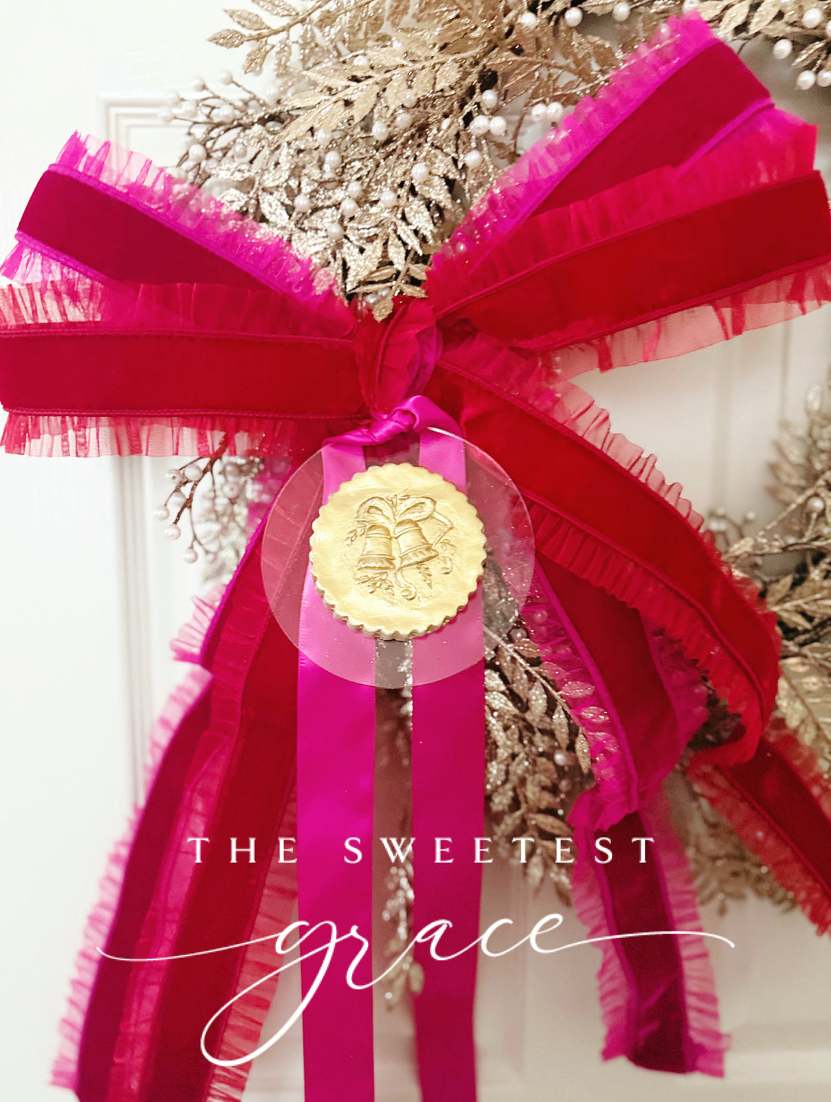 This beauty is our favorite new TSG holiday style! Glittery gold leaf and pearls are topped off with a layered pink and red ruffled velvet bow and acrylic and gold bells intaglio ornament by Elizabeth Poland Art. Perfect to style all winter long through Valentine’s Day!