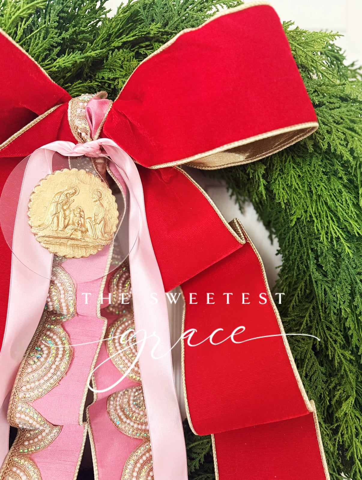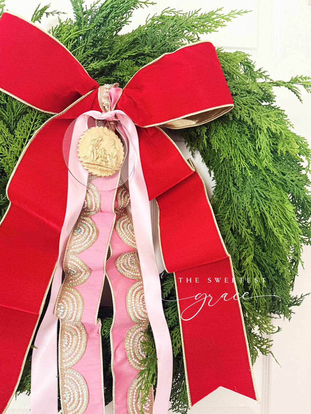28” real touch cedar is topped off with a custom layered red velvet, pink beaded, and pink satin bow and nativity intaglio.
