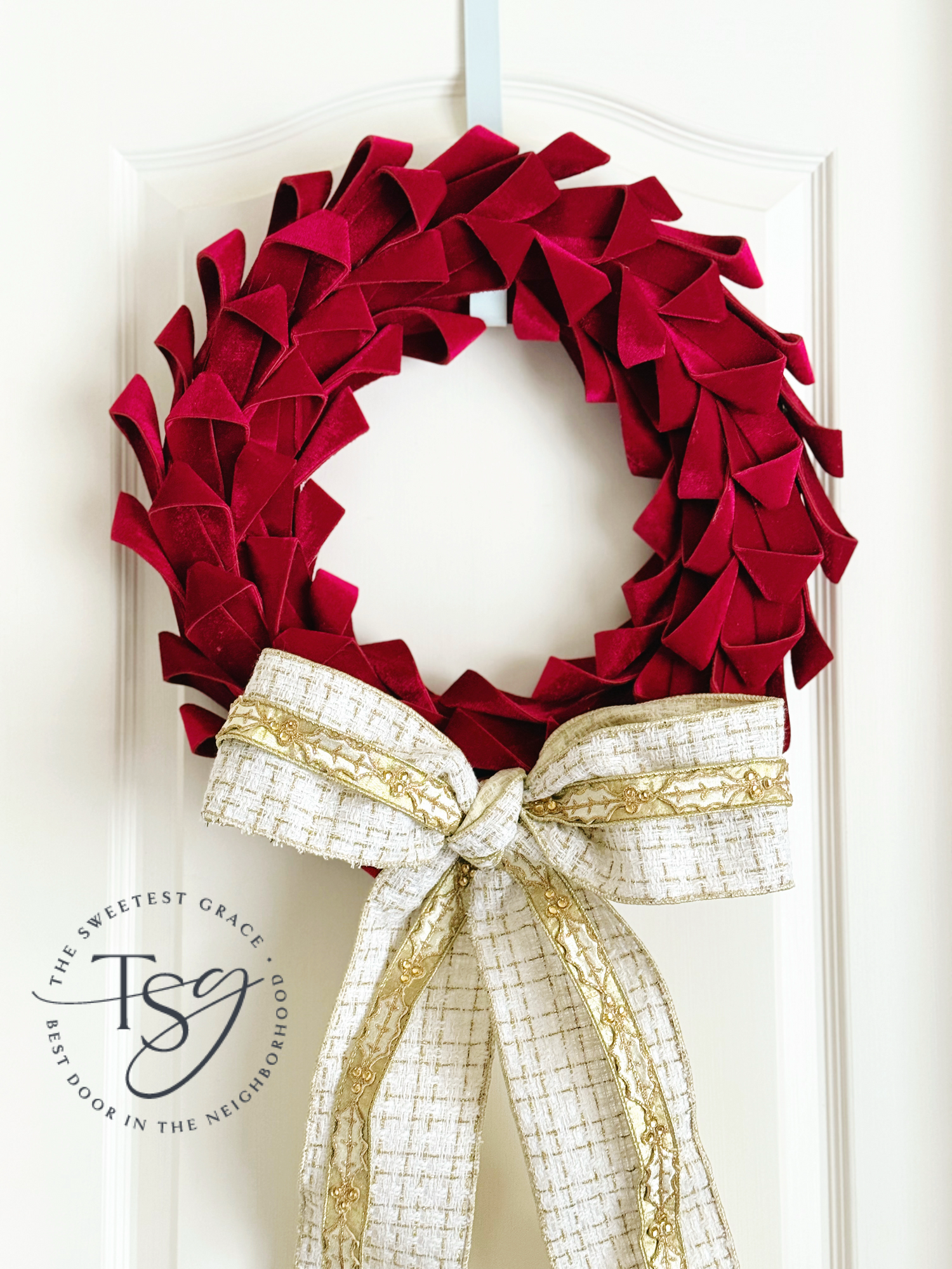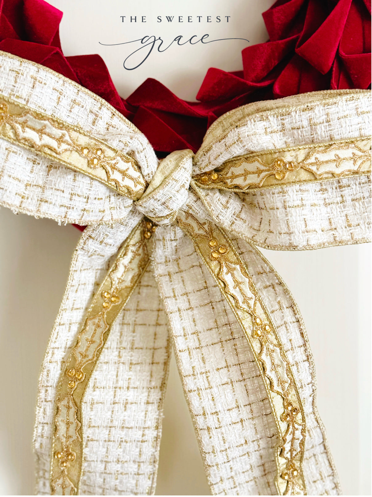 Red velvet ribbon loops topped off with a layered white tweed and gold holly bow. Perfect for your doors, mirror, mantle, or kitchen hood.