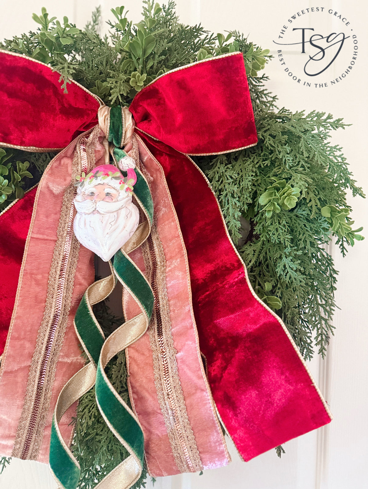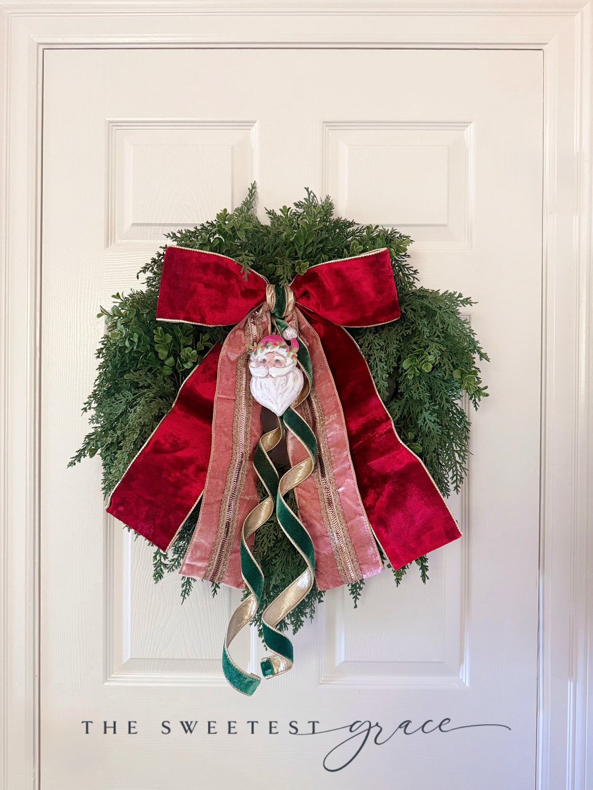 Real touch cedar and boxwood are topped off with a layered red, green, and pink sequined velvets and Santa ornament. Featured by one of our favorite influencers, NashvilleTash!