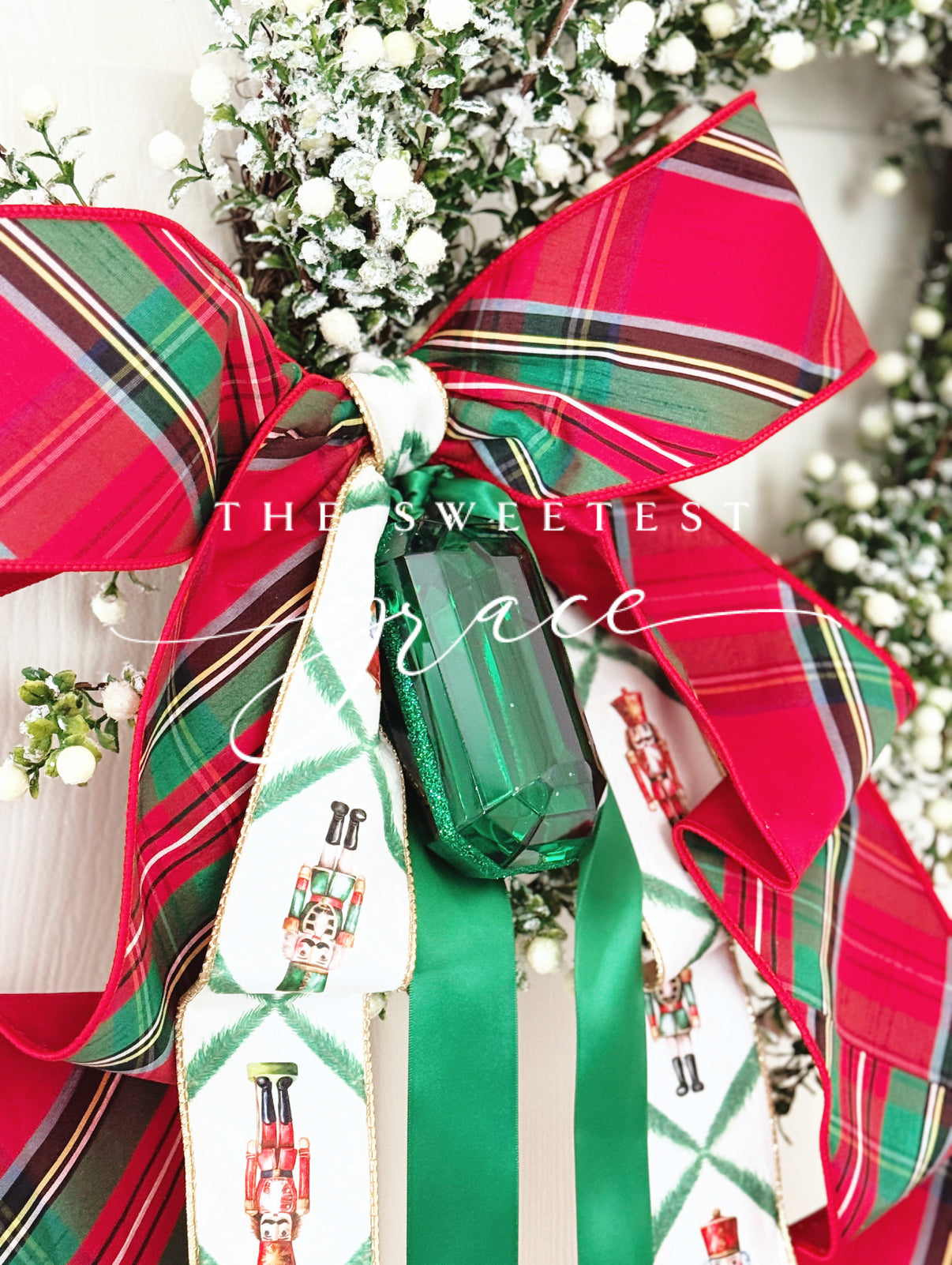 Snowy boxwood and white berry stems are finished with a layered Christmas tartan plaid, nutcracker print, green satin, and green gemstone bow. Wow your guests this holiday season with this traditional style!