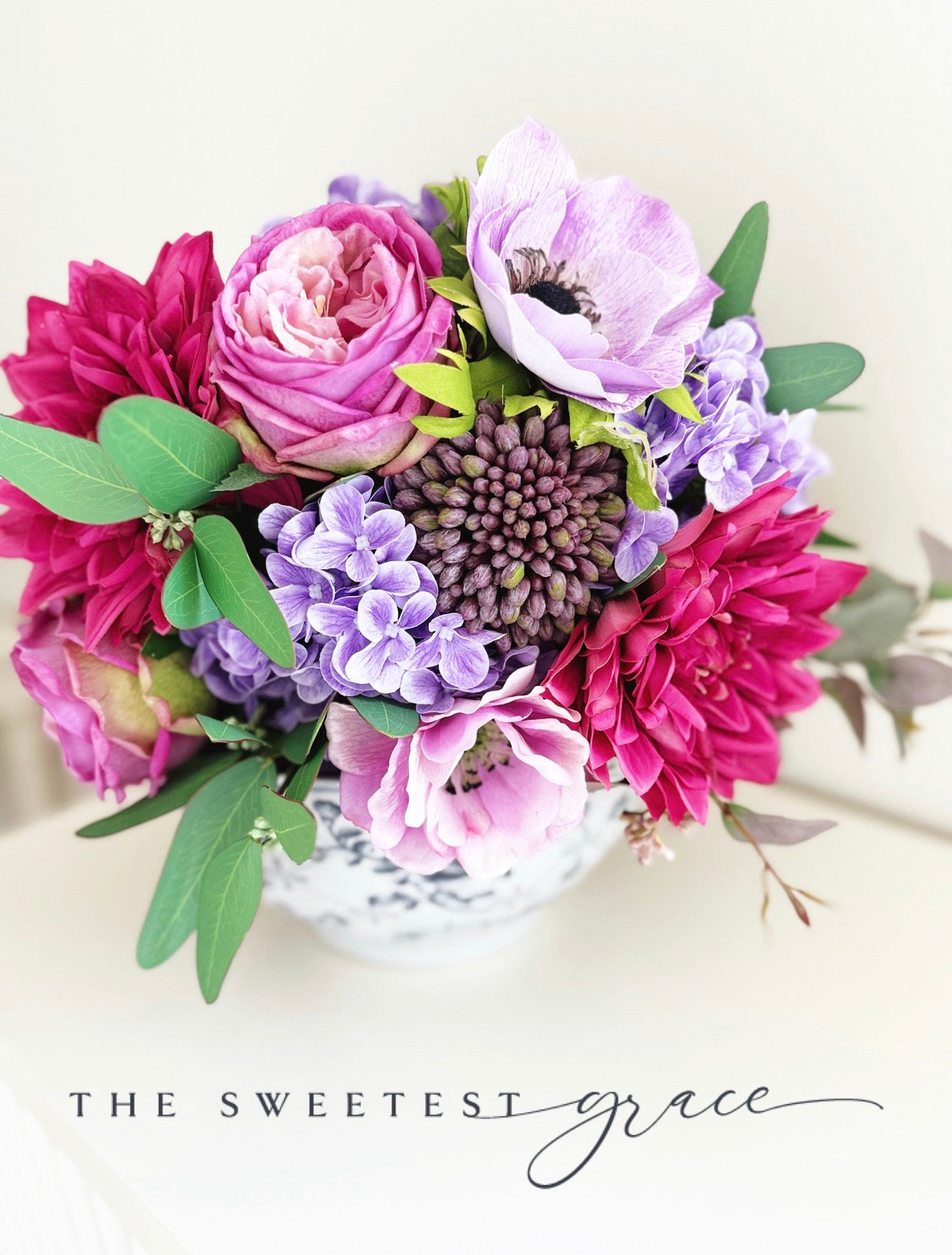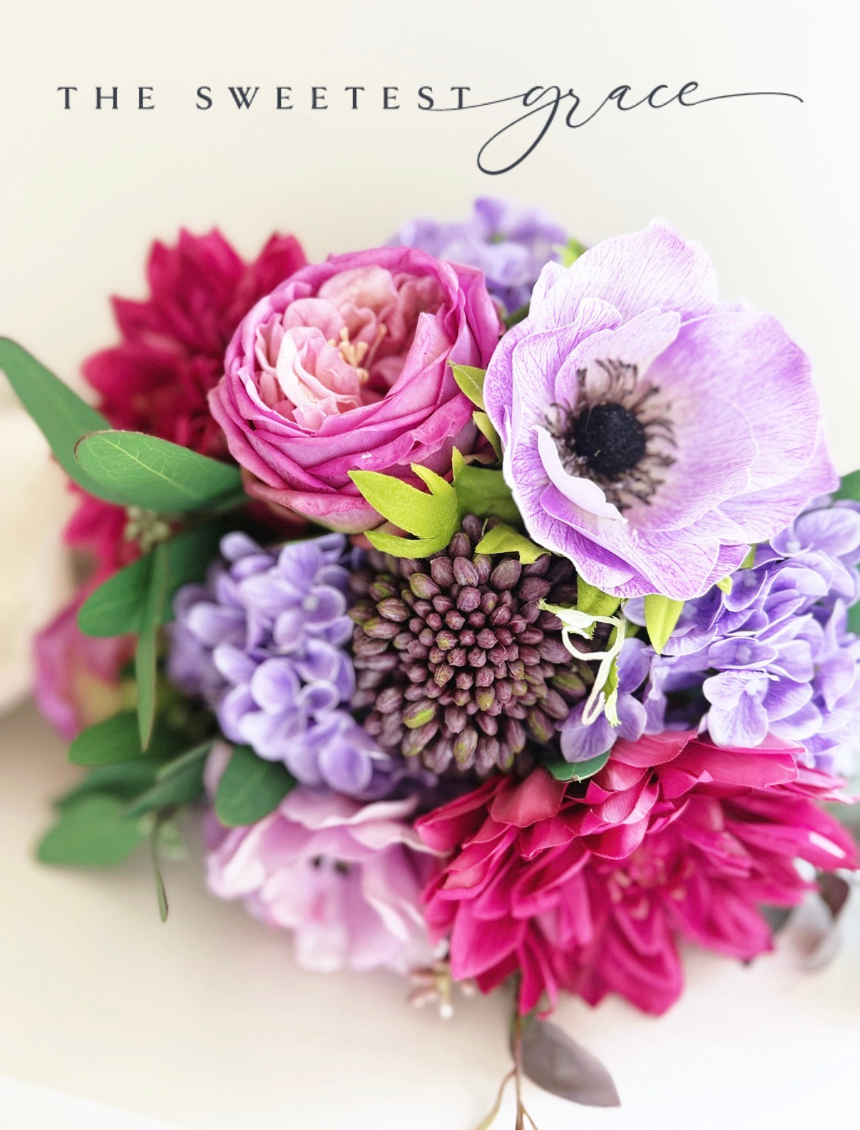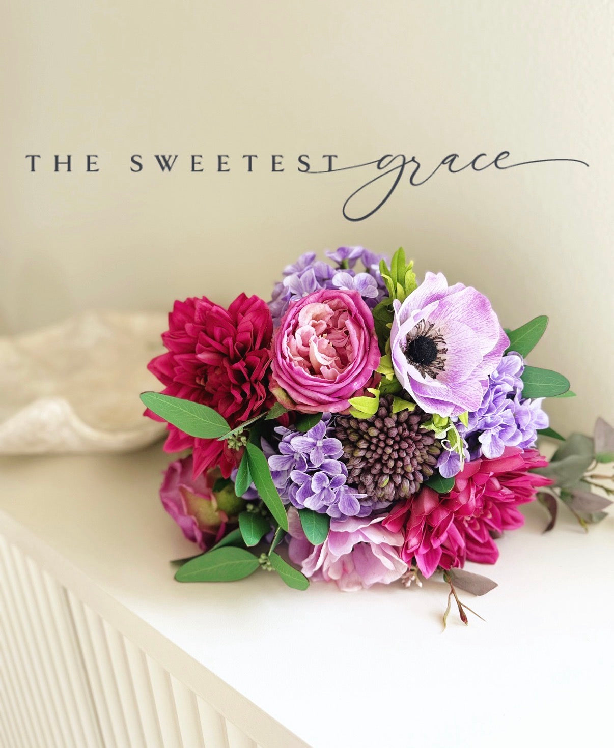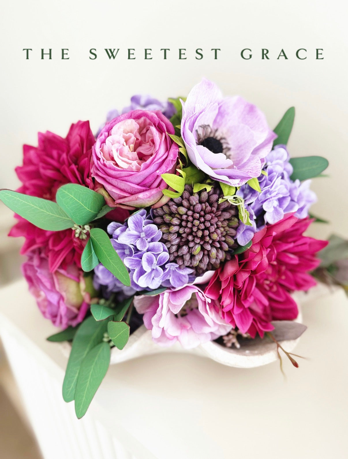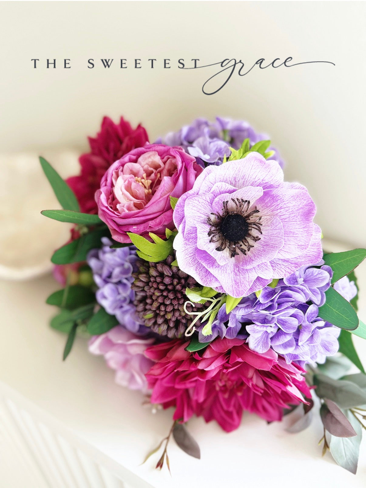 The Charlotte is a lush mix of vibrant real touch purple anemones, sedum, hydrangeas, dahlias, roses, and eucalyptus